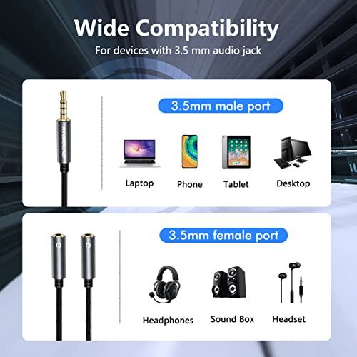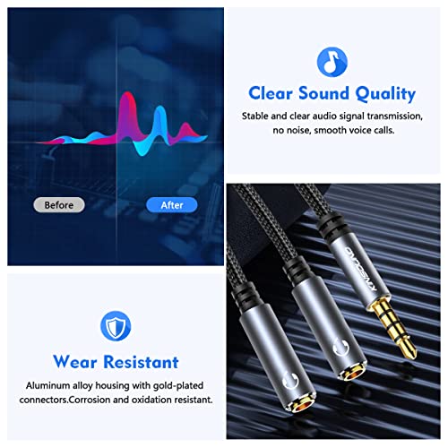 Kinsound Headphone Splitter, 3.5mm Audio Stereo Y Splitter Cable Male to Female Dual Headphone Jack Adapter with 2 Mic & Audio for Smartphone, Tablet, Laptop(Grey)