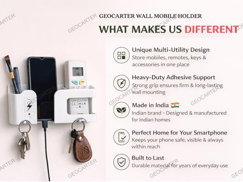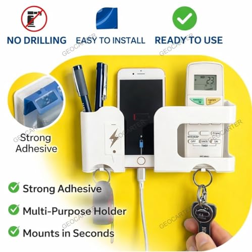 Wall Mobile Holder | Multi-Purpose Mobile Stand | Remote Holder & Mobile Charging Stand, Phone Stand for Charging with Pen and Key Holder Useful Gadget-WhiteWall Mobile Holder | Multi-Purpose Mobile Stand | Remote Holder & Mobile Charging Stand, Phone Stand for Charging with Pen and Key Holder Useful Gadget-White